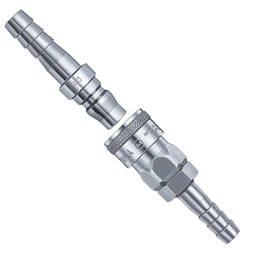 有優(yōu)越通用性的快速接頭,可用于從工廠的空氣配管到空氣工具的軟管 連接的各類用途。 ●鋼鐵材質(zhì)適用于空氣,黃銅、不銹鋼材質(zhì)適用于水。 但是,分離時流體從插塞一側(cè)流出來,敬請注意。 ●鋼鐵材質(zhì)的重要構(gòu)成部件經(jīng)過熱處理增加了強度。有良好的耐磨損性和耐久性。 ●主體材質(zhì)與尺寸種類豐富,安裝形狀標準化,可用于廣泛的空壓用途。